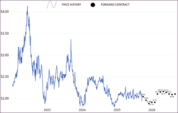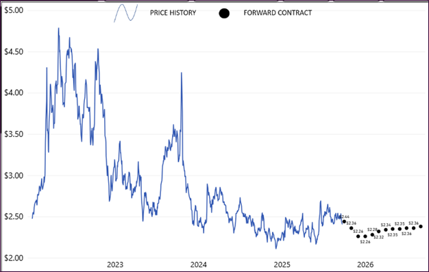 The graphs also offer insight into futures. The black dots on the right side of each give a general indication that forward contract prices can be locked in relatively around the same price points to where current daily prices are at (with gas seeing some price increases sometime in 2026 as of the time of this writing). Based on recent historical levels, forward contract prices are very close to the lows and one could view this as a promising time to lock in some fuel prices.
