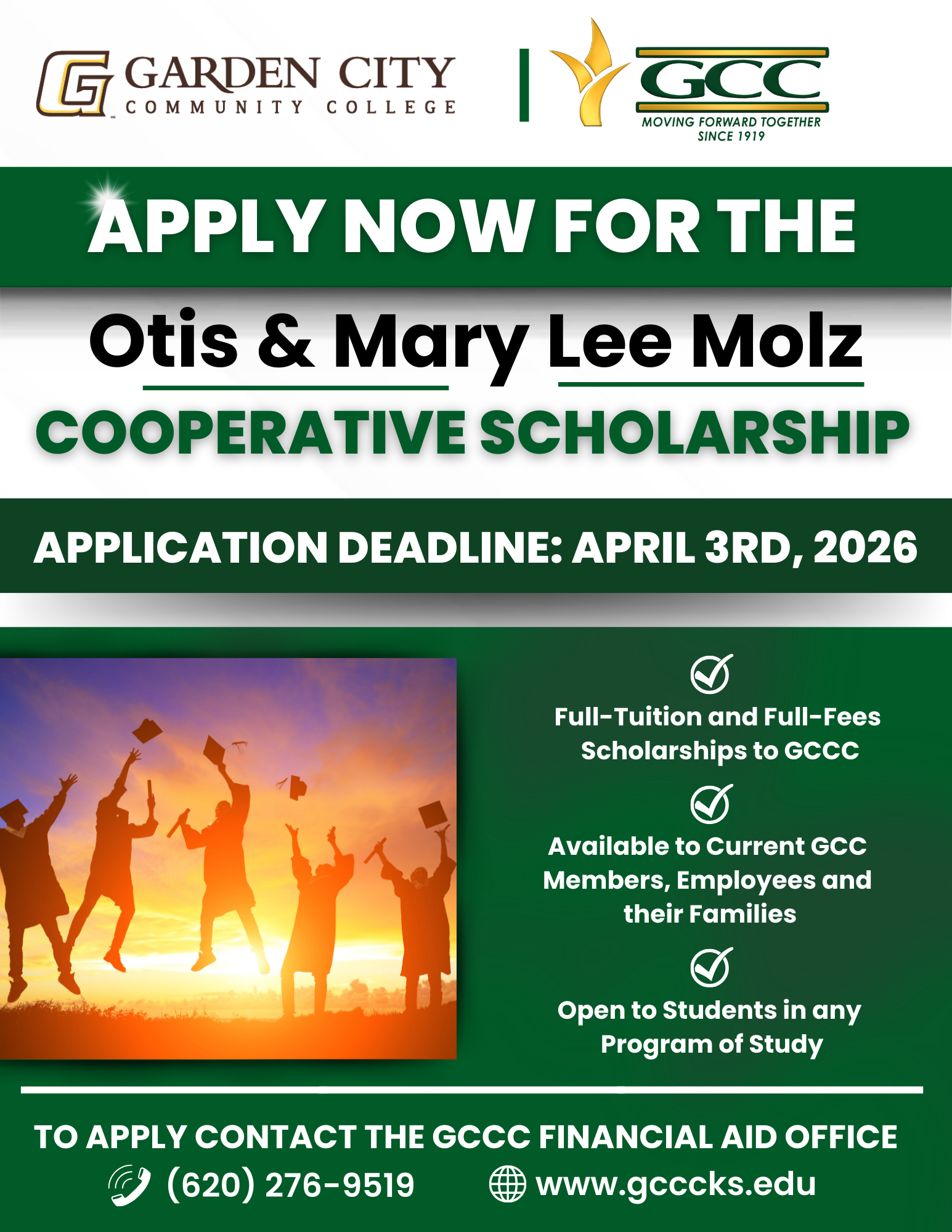 The Garden City Community College is currently accepting applications for the Otis and Mary Lee Molz Cooperative Scholarship for the 2026-2027 School Year.